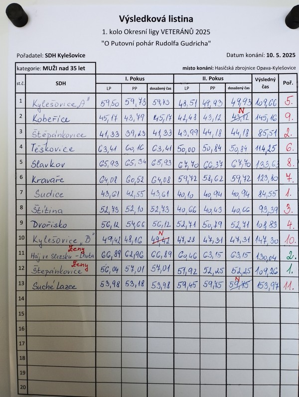 První kolo 14. ročníku Okresní ligy veteránů okresu Opava, které proběhlo 10.5.2025, nás zaválo do Kylešovic, kde nás přivítalo chladné počasí. Na startovní rošt se postavilo celkem 11 mužských a 2 ženské kolektivy.